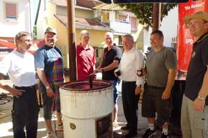 Zum sechsten Mal wurde wieder Pflaumenmus - auch Latwerch genannt - beim SPD OV Roxheim gerührt. 500 kg Obst und 150 kg Zucker wurden dabei verarbeitet. 3 Tage wurden die 4 Kupferkessel handgerührt - jeder ca. 12 Stunden lang. Und das fertige Produkt konnte sich sehen und schmecken lassen. Highlight dann der Samstag, wo zur Musik von "Tillermanns Cat" das fertige Produkt verkauft wurde. Und auch der Roxheimer Sportverein durfte sich über den Absatz von 70 Zwetschgenkuchen und fast 80 ltr. Kartoffelsuppe freuen. Abends dann noch Gegrilltes aus der Holzkiste. 10 Spießbraten und div. Stücke Krustenbraten gingen weg wie die berühmten "warmen Semmeln" . OV-Vorsitzender Michael Schaller (2 vL) und Stellvertreter Alfred Heil vom Weingut Heil (1 vL) freuten sich über die ca. 300 Besucher der Veranstaltung, die als optischer Hingucker mit der "Roten Büchse" warb. Natürlich waren auch unsere Abgeordneten in "rührender" Funktion im Einsatz - wenn auch nur kurz. Wobei klar links herum gerührt wurde !!